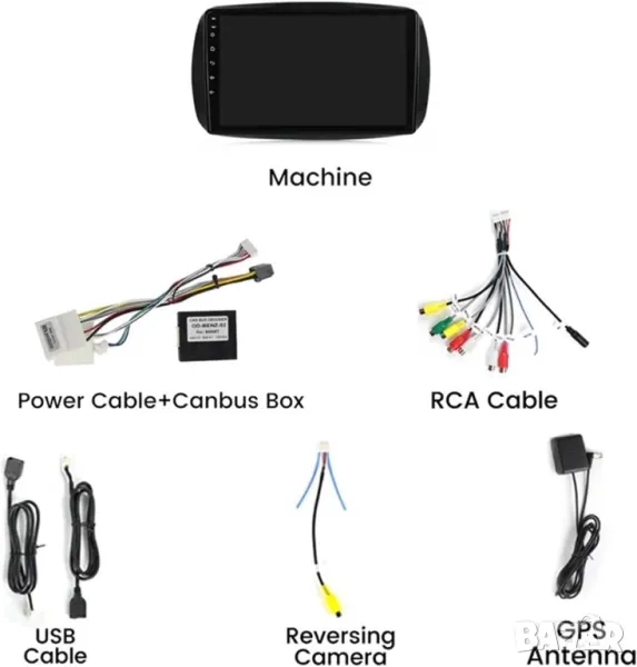 Пълен комплект с цялата рамка, преходни кабели и букси, декодери, предназначени и съвместими за монтиране на конкретния модел автомобил.