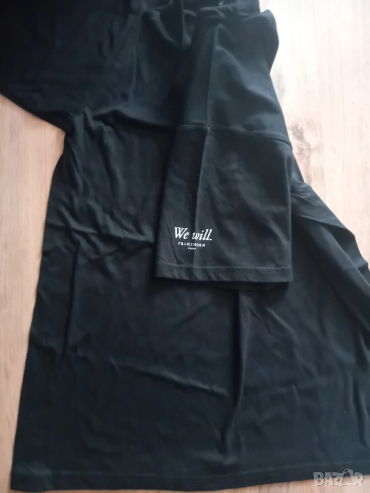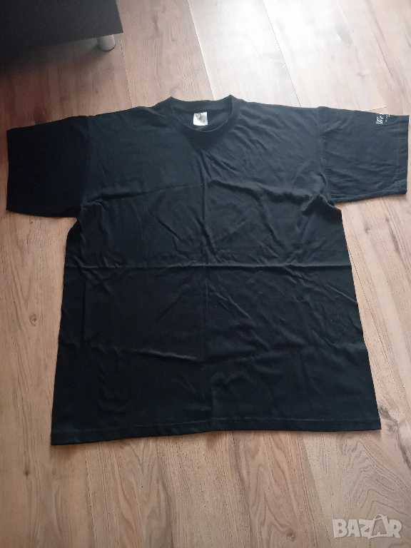 Цвят черен, с малък надпис на левия ръкав, тениската е размер XL.