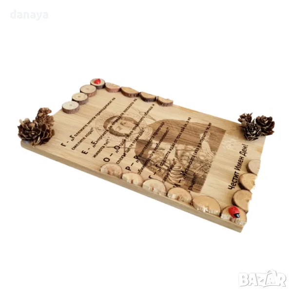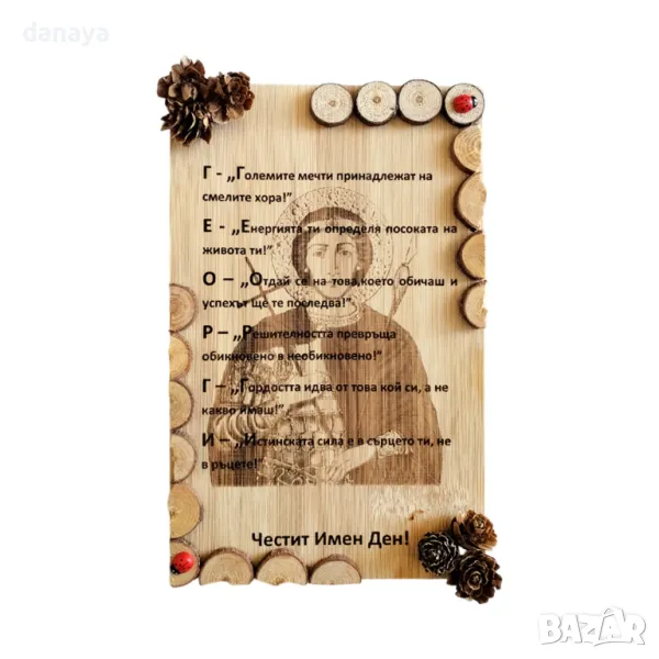 Уникален дървен сувенир за Георги – идеалният подарък за имен ден или друг специален повод! Тази декоративна плочка е с гравиран образ на свети Георги и вдъхновяващо послание, посветено специално на именика. Стилен и смислен подарък, който ще остане спомен за цял живот. Перфектна е като стенна декорация за дома или офиса.