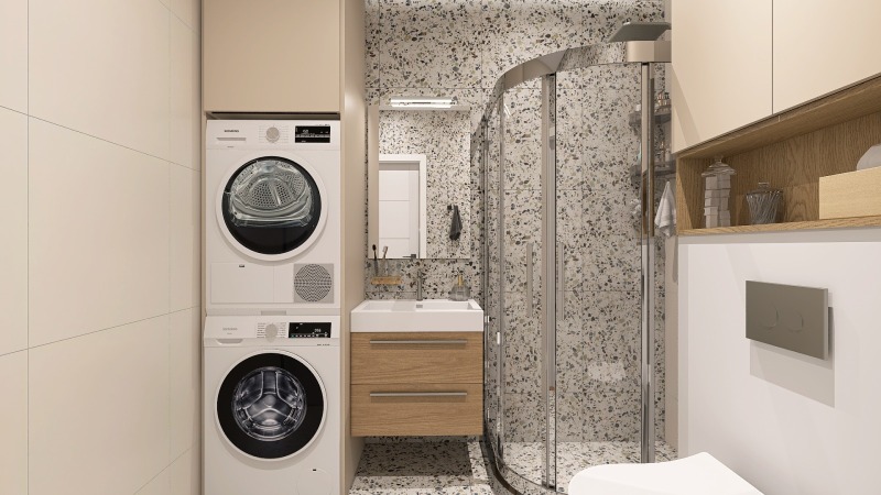 Апартаментът разполага с две бани и тоалетни. При необходимост може едната баня и тоалетна да се превърне в удобно мокро помещение с гардеробна.