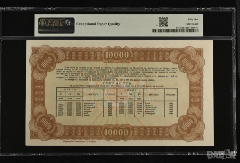 Съкровищен бон от 10 000 лева 1942 година  ( с едногодишен падеж) PMG AU 55 EPQ, снимка 1 - Нумизматика и бонистика - 50150487 Съкровищен бон от 10 000 лева 1942 година  ( с едногодишен падеж) PMG AU 55 EPQ, снимка 2 - Нумизматика и бонистика - 50150487 1/2