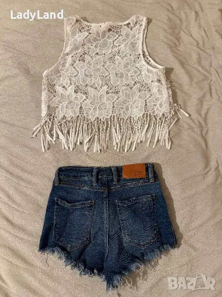 Комплектът се състои от къси дънки и потник, обличани няколко пъти, но нямат никакви следи от употреба! Размер ХС-С. Цена - 15лв.