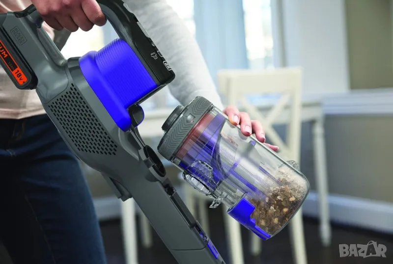 Усъвършенствани детайли. До 46 минути безжична свобода с всяка батерия предлага прахосмукачката Black+Decker. Литиевата технология осигурява постоянна производителност до последната минута без загуба на мощност. Еко Smart технологията за зареждане автоматично преминава към поддържащо зареждане, когато батерията е пълна, което спестява енергия и удължава живота на батерията. С 3-степенния индикатор за заряд винаги знаете текущото ниво на заряда и оставащото време за работа