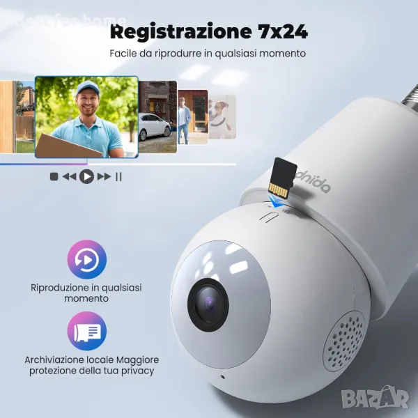 【Споделяне от множество потребители и съхранение на Micro SD карта】 Крушката с Wifi камера с Wifiza кабели може да споделя устройството с членове на семейството с различни акаунти чрез приложението, поддържайки едновременно гледане на видеоклипове от до 5 души. Позволете на членовете на семейството да наблюдават домашната сигурност заедно. Можете да запазвате записаните видеоклипове на SD карта, като поддържате SD карта до 128G (Micro SD не е включена в комплекта).