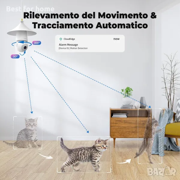 【Двупосочно аудио и звуково и светлинно предупреждение】Камерата с крушка има вградено аудио, което може да се използва чрез приложение за комуникация с посетители или за предупреждаване на натрапници. Можете също така да настроите различни аларми при задействане на детекция: звукова аларма или светлинна аларма. Когато детекцията се задейства късно през нощта, камерата издава висок звук на сирена/ярки светлини чрез зададения тип аларма, за да изплаши натрапниците.