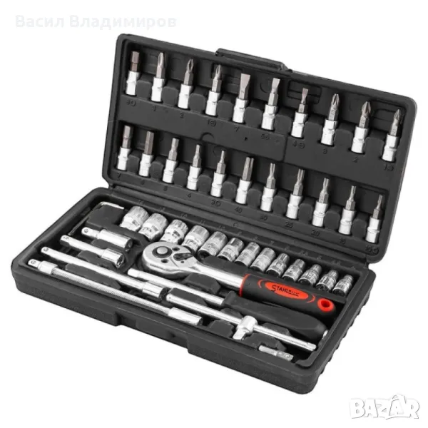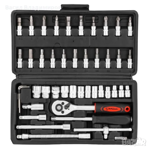 Комплект от 46 части гедоре 1/4 на марката STAHLMAYER . Комплекта е изработен от висококачествена стомана и е достатъчно устойчив на тежки натоварвания. Инструментите са прегледно подредени в пластмасова кутия за удобно съхранение и транспорт.
