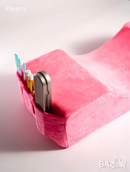 Отстрани на възглавницата има допълнителни джобчета за материали.