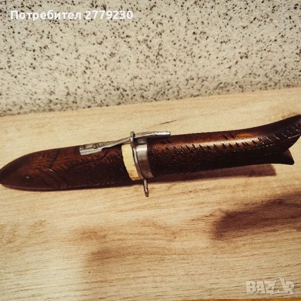 Оригинален комплект нож с вилица във дървена поставка във формата на риба, подходящ за колекция, сувенир или за ползване на пикник. При интерес на съобщение или обаждане.