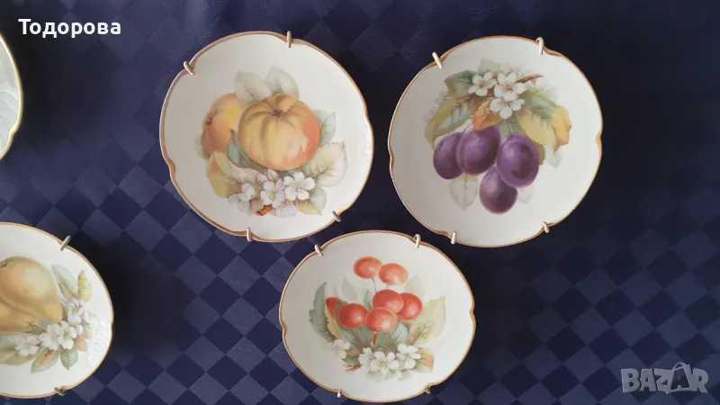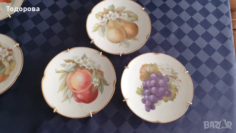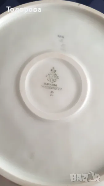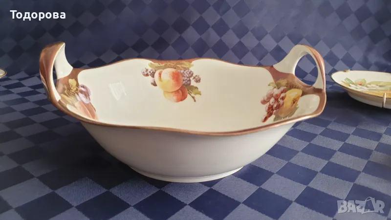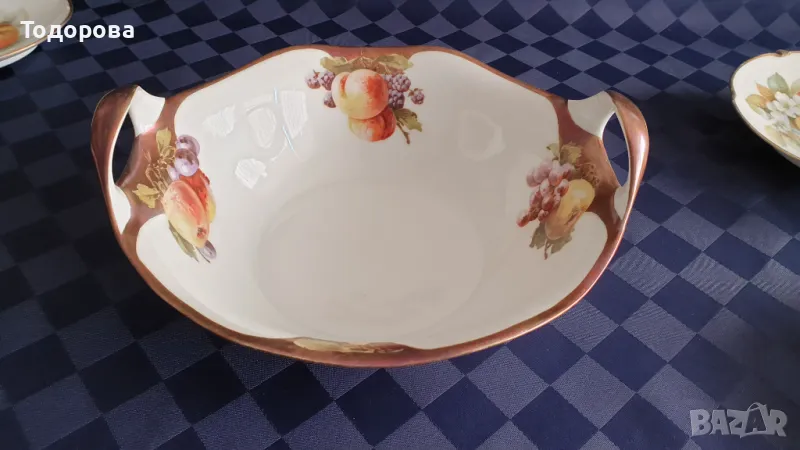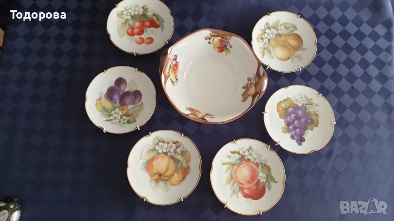 Порцеланов комплект Bavaria Tirschenreuth.Състои се от голяма фруктиера,купа и 6 десертни чинии с приспособления за окачване на стена.