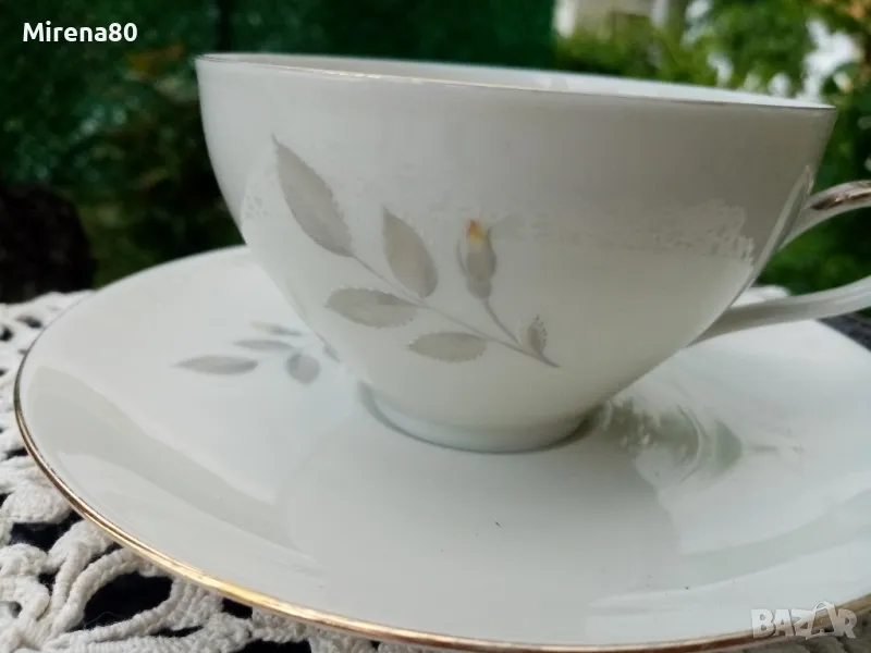 Винтидж чаша с чинийка от костен баварски порцелан от миналия век. Фина, лека и прозирна - не се усеща в ръката. Цветът е екрю с нежна флорална декорация, вкл. и вътре в чашата. Вместимост - 200 мл, Отлично състояние, с изтриване на позлатата единствено на дръжката.