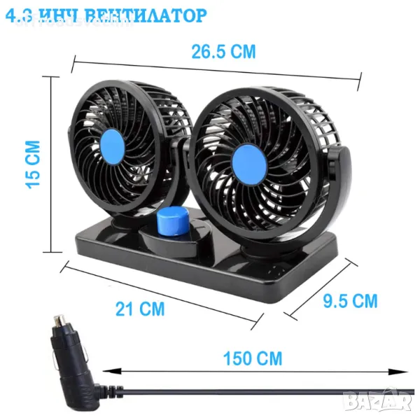 Двоен вентилатор за автомобили, джипове, бусове, камиони 4.3 инча 12V