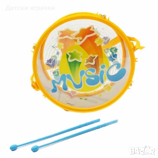 Детска музикална играчка барабан с 2 палки и коланче. Играчка, с която вашето дете ще развива ритъм, такт и координация между ръцете и очите. Забавленията с детски музикални инструменти развива въображението интелекта, усъвършенства се ума и спомага за развитието на логическото мислене и концентрацията.