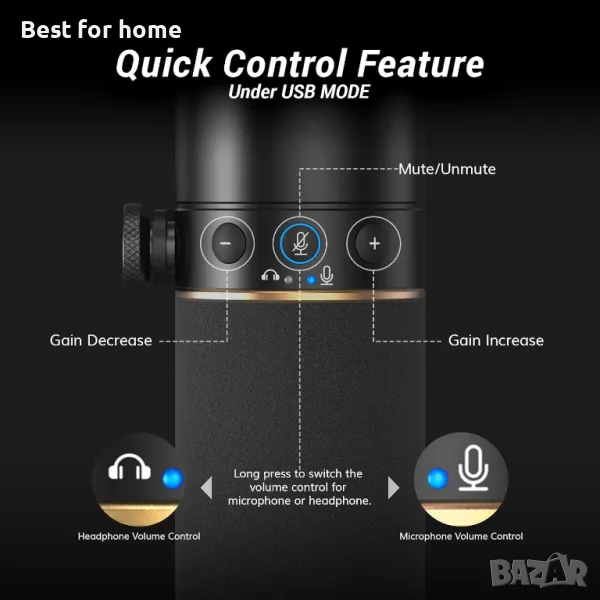 Перфектен за създатели на съдържание: В USB режим можете директно да натискате бутоните, за да управлявате микрофона. С 3,5 мм жак за слушалки можете да следите гласа си в реално време. Този микрофон е перфектният избор за YouTuber-и и TikTok инфлуенсъри.