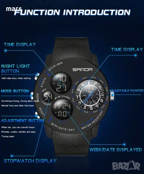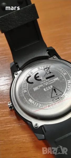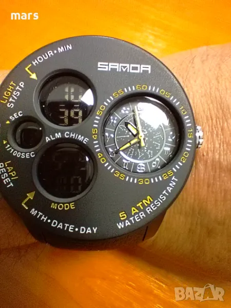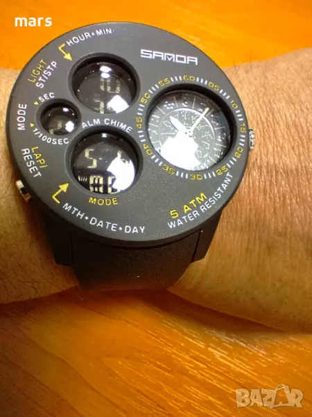 часовника е нов, доста голям диаметър-47мм., но лек и удобен, функциите са дадени на една от снимките, има и осветление.