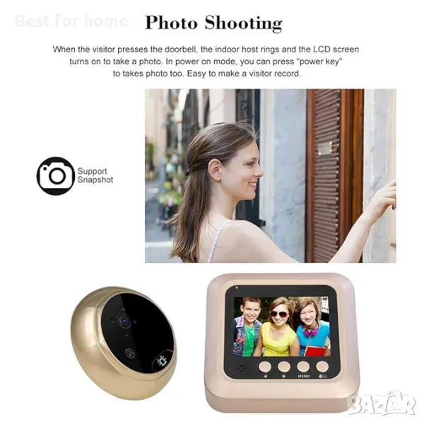 Снимка: Когато посетителят натисне звънеца на вратата, вътрешният хост звъни и LCD дисплеят се включва, за да направи снимка. В режим на включване можете да натиснете „клавиш за захранване“, за да направите снимка. Лесно е да се направи запис на посетител.