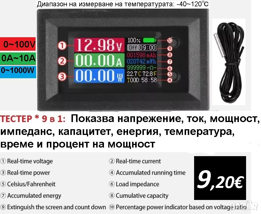 мощност, импеданс, капацитет, енергия, температура, време и процент на мощност