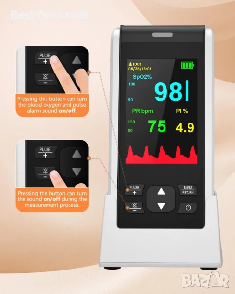 ВИСОКА ТОЧНОСТ И БЪРЗИ РЕЗУЛТАТИ Пулсният оксиметър има висока точност от 1%. Може точно да открие SpO2, PR (пулсова честота) и PI (перфузионен индекс). Резултатите от измерването на оксиметъра се показват за 2-5 секунди на големия LED екран. Можете да видите резултатите от измерването ясно.