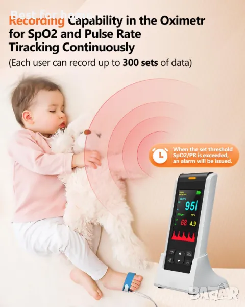Настройки за измерване през нощта или непрекъснато измерване и аларма: измерванията могат да се правят непрекъснато през нощта или през деня и данните ще бъдат запазени. Няма нужда да се притеснявате. Системата за напомняне на дисплея на оксиметъра дава звуково предупреждение, когато показанието надвиши зададения праг.