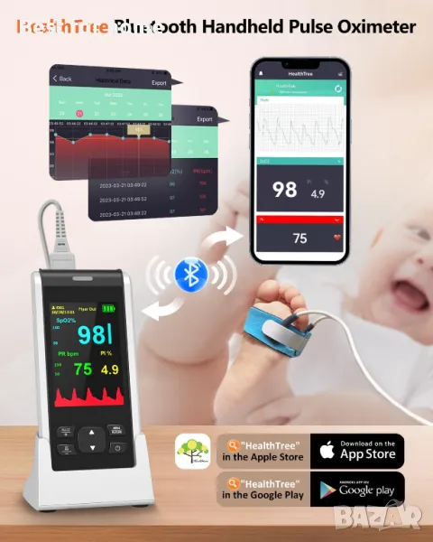 Акумулаторен пулсов оксиметър HealthTree, ръчен пулсов оксиметър, монитор за кислородна сатурация в кръвта за бебета и възрастни, измерване на SpO2 и пулсова честота