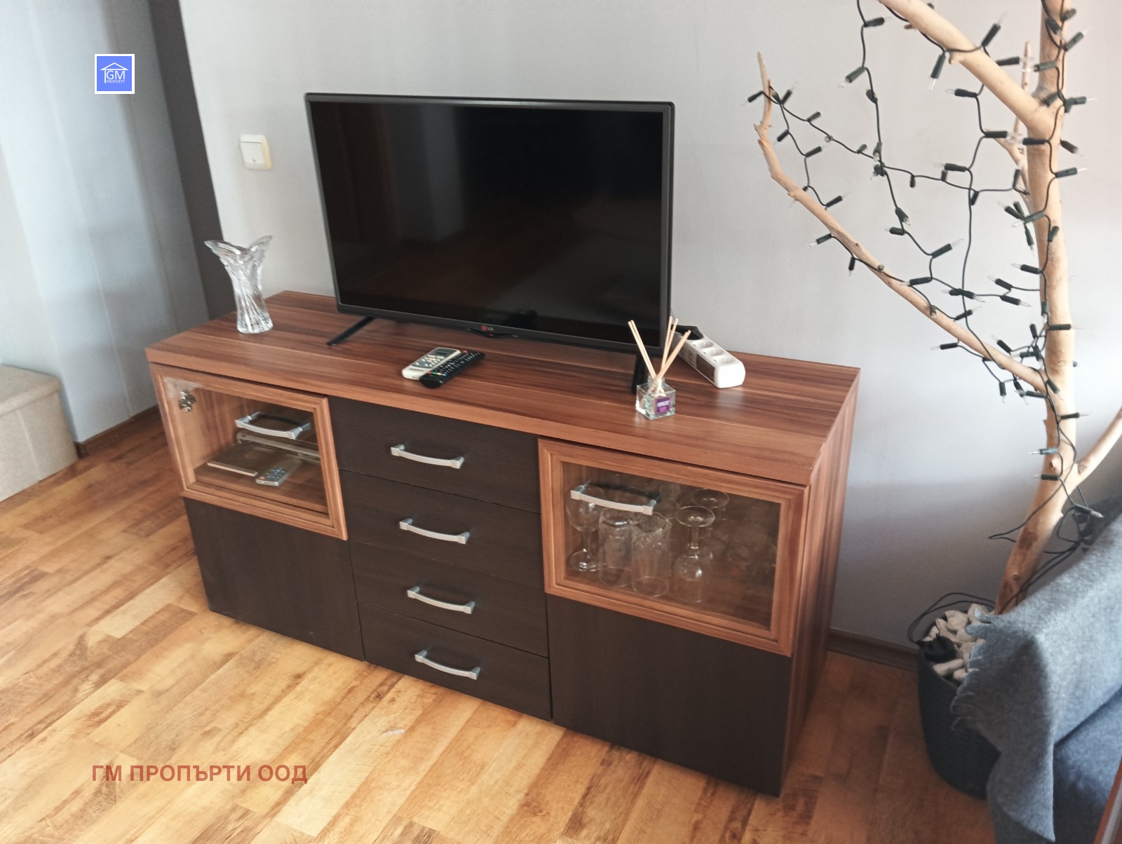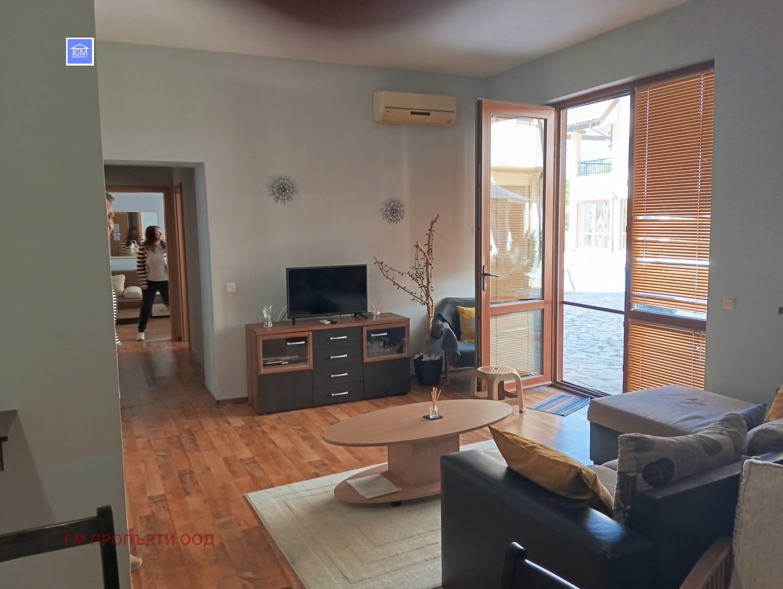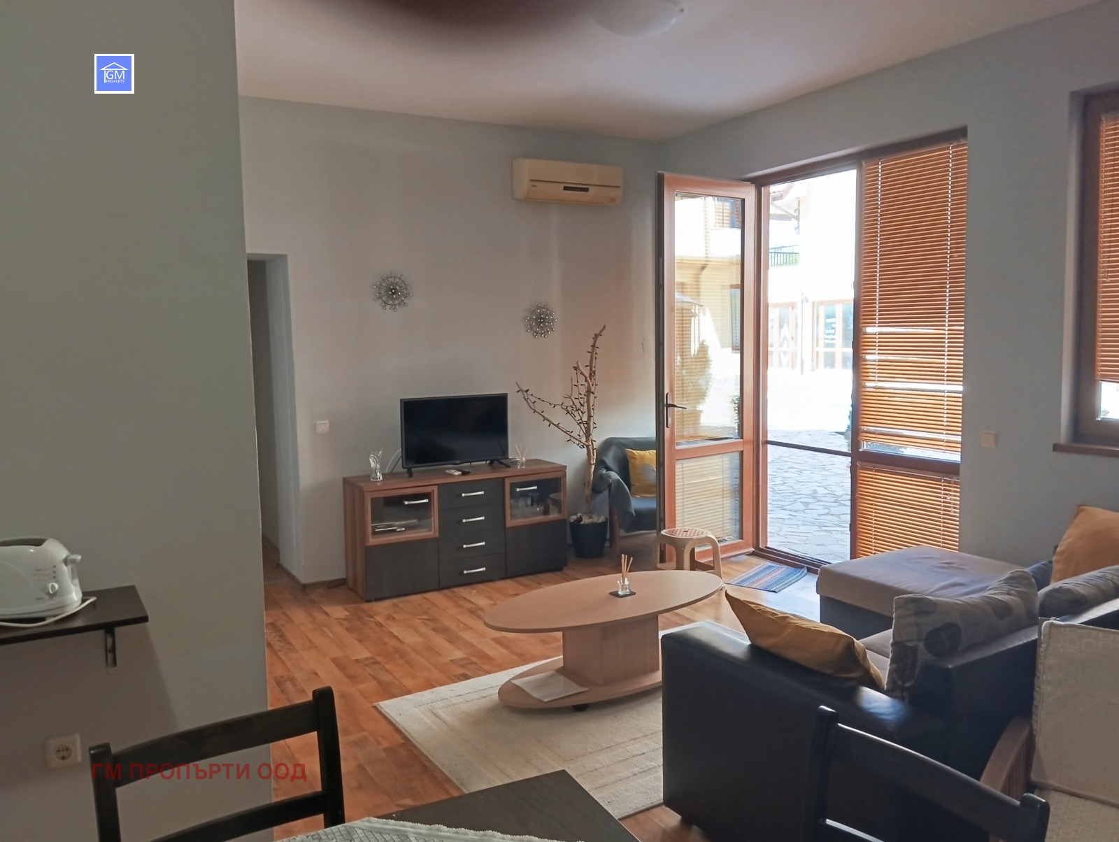 Апартаментът е напълно обзаведен и оборудван с всички необходими електроуреди, включително три климатика.