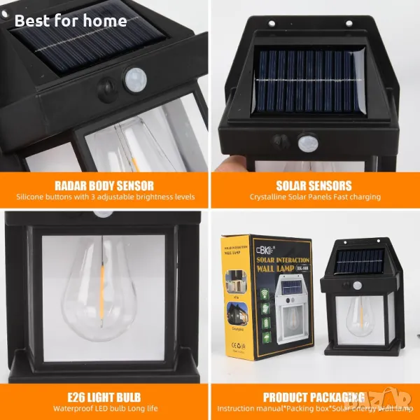 【Слънчево зареждане】: Слънчевата стенна лампа има високоефективен соларен панел с висок коефициент на фотоелектрическо преобразуване, който може да се използва и при слаба светлина или дъждовни дни. Градинските лампи имат вграден сензор, няма нужда да се включват и изключват многократно и ще се включват и изключват автоматично през нощта и призори.