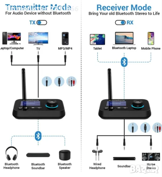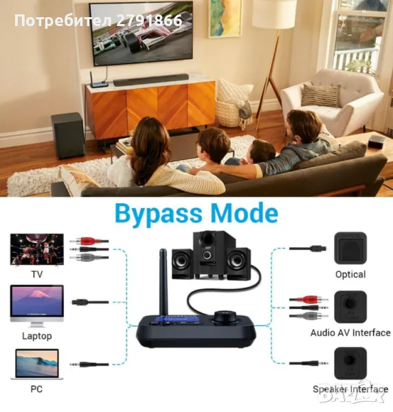 В режим на предавател можете да свържете до два безжични високоговорителя или слушалки чрез Bluetooth и вашия аудио източник чрез кабелните входове. В режим на приемник можете да свържете високоговорители или слушалки чрез кабелните входове и вашия аудио източник безжично чрез Bluetooth. В режим на байпас, високоговорителите и аудио източниците се свързват чрез устройството, използвайки SPDIF или AUX входове и изходи.