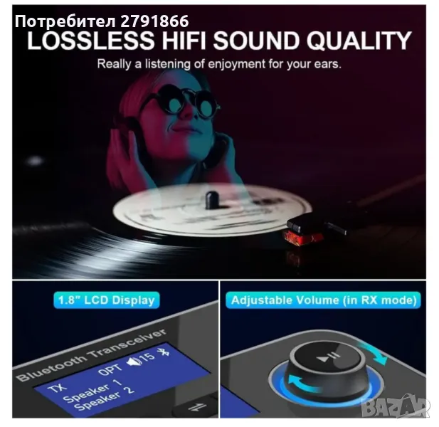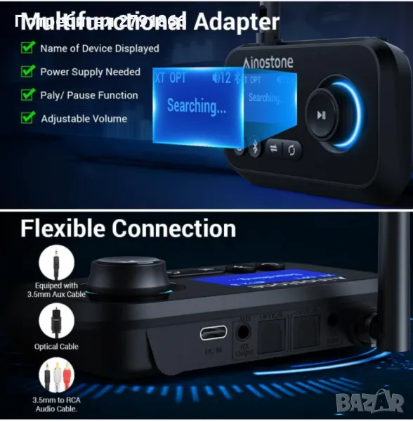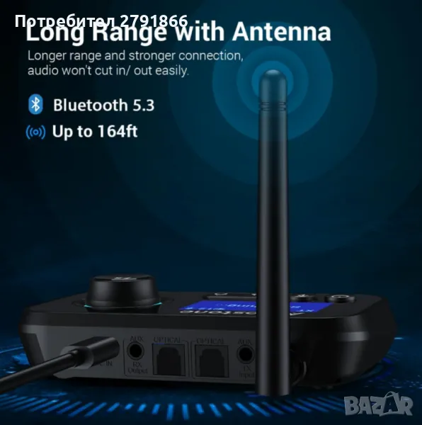 Устройството разполага с 4.5-инчов LCD дисплей и физически контроли на превключвателя, които ви позволяват лесно да управлявате устройството и да получавате информация за свързаните устройства. Устройството поддържа Bluetooth 5.0, който осигурява висококачествен звук, ниска латентност и голям обхват.