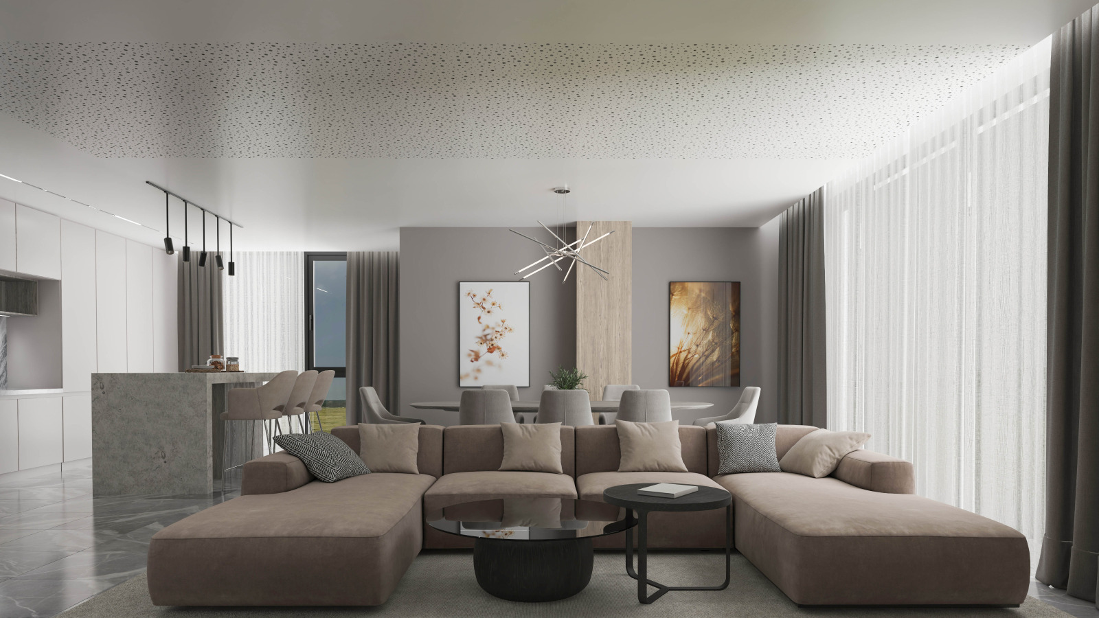Апартамента се състои от: антре, дневна с трапезария и кухненски бокс, две спални, две бани с тоалетни, склад/мокро помещение и тераса.