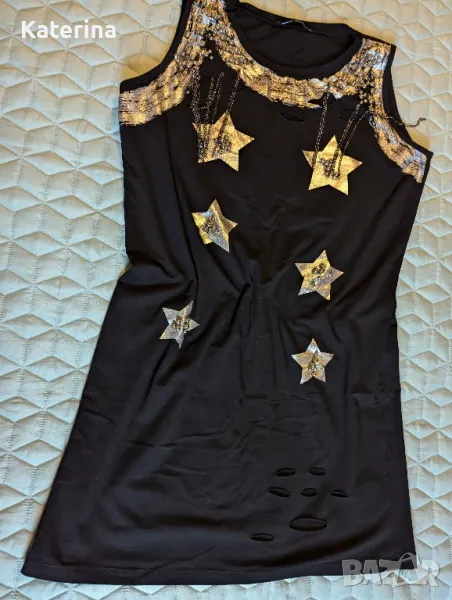 Черна риза отпред къса но не много,отзад дълга към нея има коланче. Туниката е подарък. Размер М са. Запазена е.