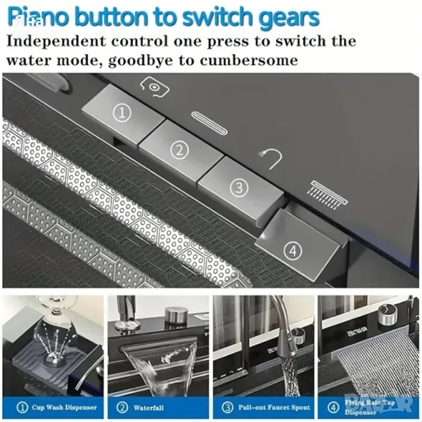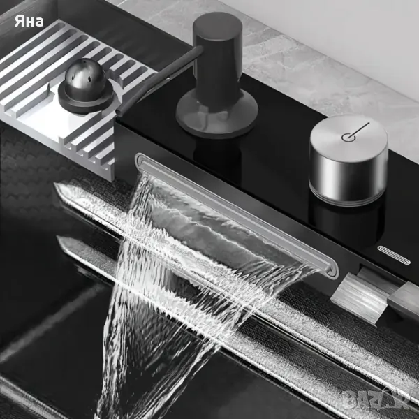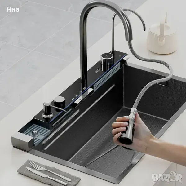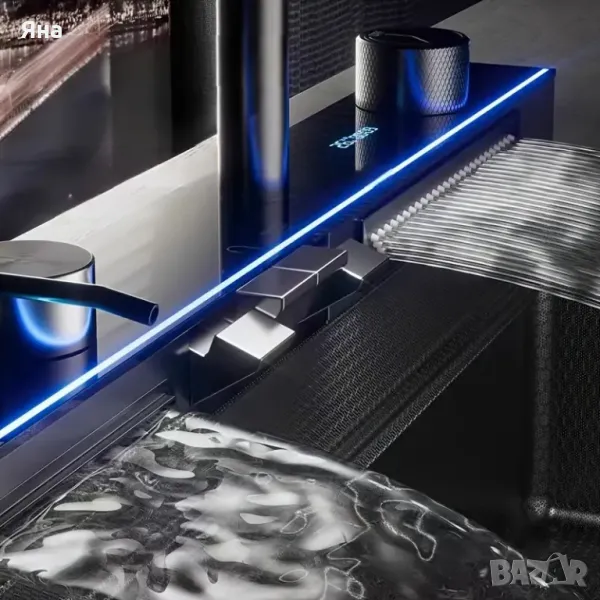 Мивката разполага с два водопадни смесителя, които създават елегантен и динамичен поток на водата, както и универсален изтеглящ се смесител с три режима на изтичане – пулверизация, директен поток и смесен режим, което ви дава пълна свобода при миене на съдове и подготовка на храна.Интегрираният цифров температурен дисплей ви позволява да следите температурата на водата в реално време. LED осветлението не само добавя стил към кухнята, но също така осигурява по-добра видимост при работа.