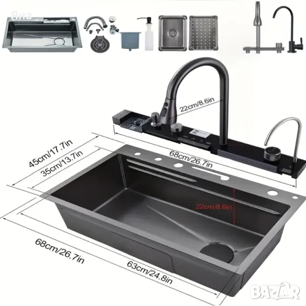 мивката включва кошница за отцеждане, метална, дозатор за течен сапун, както и специално място за измиване на чаши. Тези аксесоари ви помагат да оптимизирате работното пространство и да направите ежедневните задачи в кухнята по-лесни и по-приятни.
