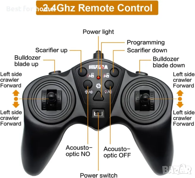 11-канална пълнофункционална играчка: Движи се напред/назад, завива надясно/наляво, повдига и спуска нивелиращ нож/заден рипер, включва/изключва светлината и звука. Риперът и булдозерът могат да се управляват на различни степени. Многобройните функции осигуряват много забавление на децата.