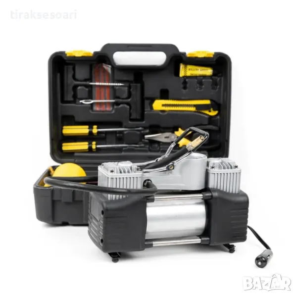 компресор за гуми, двубутален компресор, компресор в куфар, компресор с инструменти, компресор с фитили за гуми, офроуд компресор, мощен автомобилен компресор, компресор за джип, компресор за 4x4, компресор за офроуд, комплект за гуми, компресор за високо налягане, мобилен компресор, компресор с аксесоари, компресор за пътна помощ