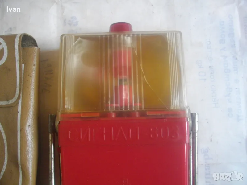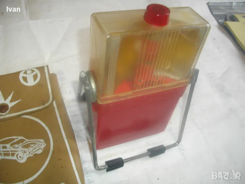 ОПИСАНИЕ на ретро Соц аварийна сигнална лампа - фенер от НРБ - българска - цена 99 лв. Оригинална от Соц времето. Произовдство 1980 г. Марка и модел - Сигнал 803. Запазен външен вид и добро работно техническо състояние. Работи на 3 бр. батерии от кръглите, дебелите. Има и извод за зареждане от акумулатор. Без батерии. Метална развижна стойка за самостоятелен стоеж в различни позиции. Оригиналната соц крушка на фенра е налична. Функция мигаща светлина или постоянна светлина.Обхват на светлината - 25 м. Кожен оригинален на модела калъф - ест.кожа с тик-так метална закопчалка..Размери на калъфа с лампата фенер авариен - 220 х 140 х 45 мм.