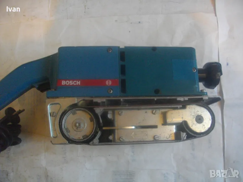 Синя серия от старото качество на Бош. Масивна машина, с голямо тегло от 5,0 кг. Мощност 950 вата, защита 4,6 ампера. Автостп, бакелит предна дръжка.Алуминиева добна основа. Права горна повърхност за обърнат стабилен стоеж при обърнато шлайфане.Защита на кабела от прегъване. Размери на машината - дълж. 465 мм, шир.135 мм, височина 155 мм. Тегло 5,0 кг. Поставена оригинална шкурка шлифовъчен пояс.