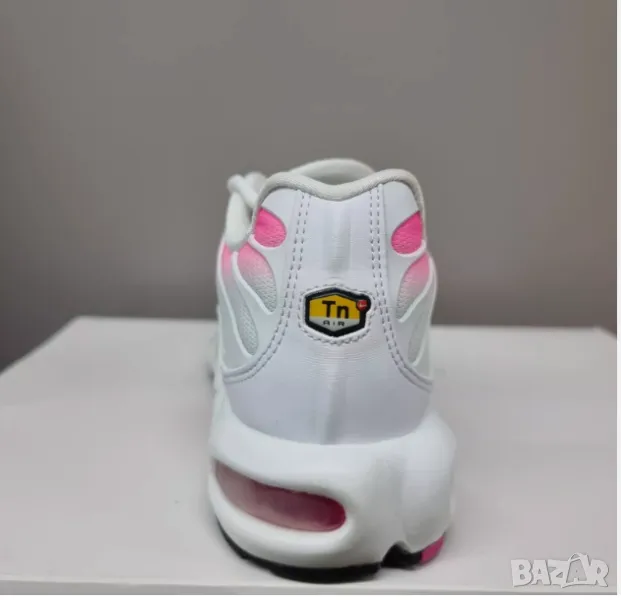 Малки бели лого „Swooshes“ украсяват страничните стени, очертани в розово, а емблемата „Tn“ на петата придава на тази бяло-розова TN печат на одобрение, че е готова за употреба. Под стъпалото, системата Max Air осигурява несравним комфорт с хващаща външна подметка за превъзходно сцепление както на улицата, така и във фитнеса.