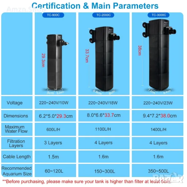 [Приложение] Филтър TC-3000C е подходящ за аквариум с обем 350~500 литра. Моля, не го използвайте за аквариуми с обем под 350 литра. Ако имате въпроси, не се колебайте да се свържете с нас.