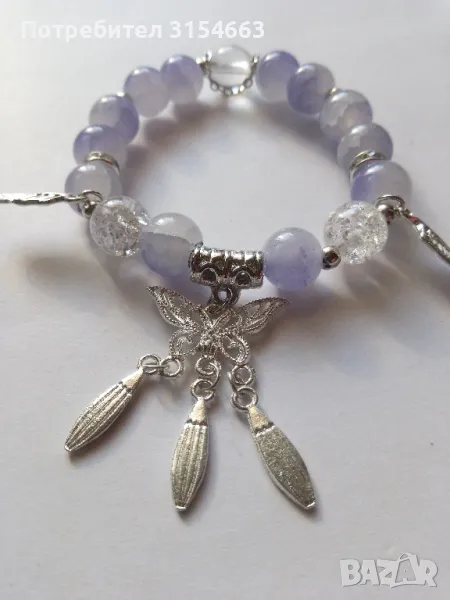 Гривна от мъниста планински кристал и котешко око. С висулки с форма на пеперуда и пера. Размери на пеперудата 3,5 см на 2,5 см. Гривната е с диаметър 6,5 см. Разтяга се.