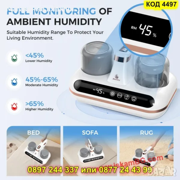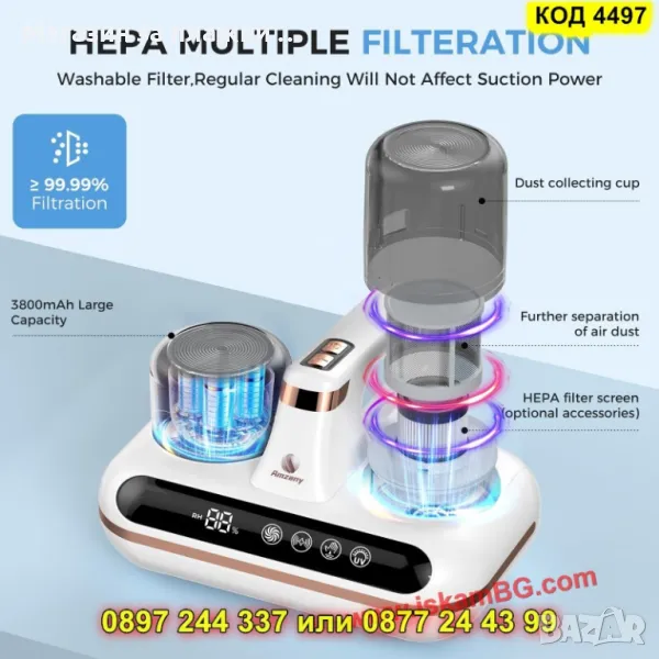 ✅ UV-C стерилизация (253.7nm): Убива до 99.9% от бактериите, акарите и вирусите