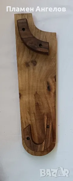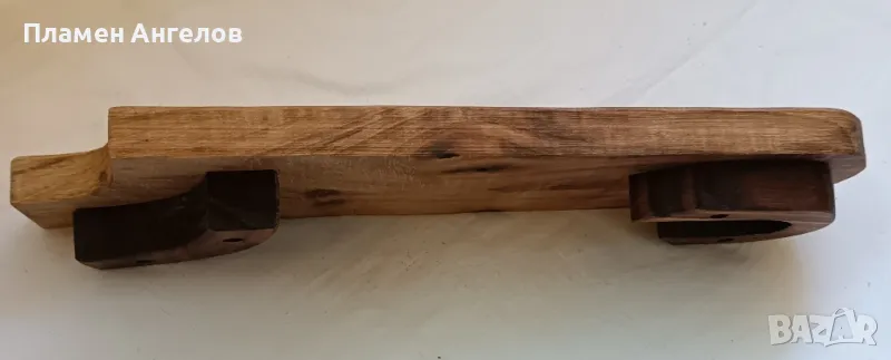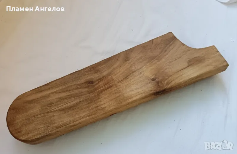 Дъска за поднасяне на сухи мезета. Ръчно изработена от светъл орех със крачета от тъмно кафяв орех. Масивна, екологична дървесина идеална за сервиране, поднасяне на храна и мезета. Стара изработка, неопотребявана с размери:дължина 39.5см, широка от единия край 11 см., в другия край 9.5 см., дебелина 2.2 см., висока 4.5 см.