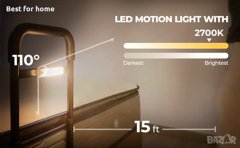 Оборудван с осветление за движение: Оборудваната светлина за движение ви позволява да осветявате околностите си, когато ставате през нощта, така че да не се притеснявате за неудобства в тъмното. Просто махнете лампата и тя ще свети, където и да отидете. Не се притеснявайте, че ще включите осветлението и ще смутите членовете на семейството си, които почиват около вас.