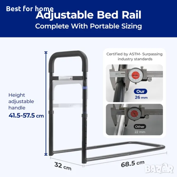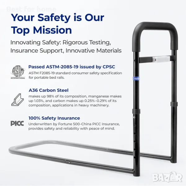 Американското дружество за тестване и материали, сега известно като ASTM International, е организация, която разработва и публикува международни стандарти за редица материали, продукти, системи и услуги, включително тези, използвани в строителството, производството и транспорта. ASTM International е световно призната организация за стандартизация, която разработва и публикува консенсусни технически стандарти за материали. Сертификацията показва на вас и вашето семейство, че нашите предпазни огради за легла следват най-добрите практики, за да се гарантира здравето и безопасността на потребителите и пациентите.