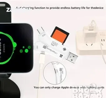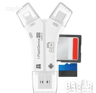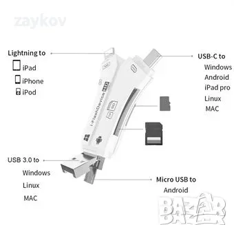 Това устройство 4 в 1 съчетава четец на карти и зарядно устройство и предоставя гъвкава функционалност за всички ваши нужди. Поддържа различни връзки, включително iP, USB-C 3.0, USB-A 3.0 и Micro, което го прави съвместим с широк набор от устройства