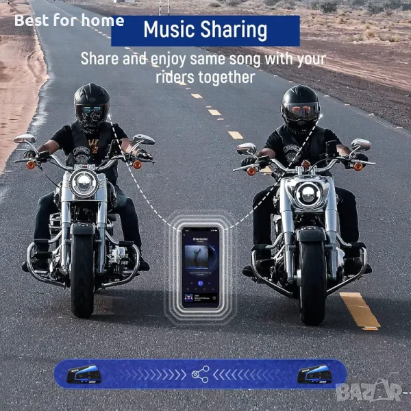 Споделяне на музика и Hi-Fi стерео звук: Bluetooth слушалките за каска B4FM позволяват на 2 мотоциклетисти да се наслаждават на една и съща песен с двойно щракване на БУТОНА ЗА ЗАХРАНВАНЕ, разполагат с коаксиални високоговорители Mylar, устойчиви на вятър микрофони и DSP/CVC технология за несравнимо 3D качество на звука. Нека се насладим на кристално чиста музика дори при скорости до 120 км/ч.
