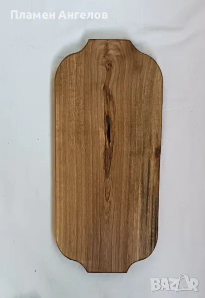 Дъска от естествена масивна дървесина - тъмен орех. Ръчно, екологично изработена. Подходяща за поднасяне на масата сухи мезета, също и за рязане. Покрита с хранително масло, лесна за поддръжка. Стара изработка-старо дърво, неопотребявана. Размери :дължина 33см.,ширина 15см.,дебелина 2см.