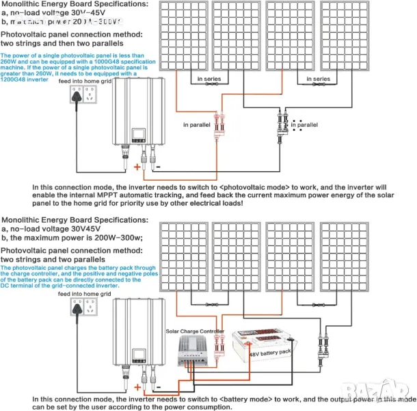 【Широка съвместимост】Микро инверторът поддържа различни източници на постоянно напрежение: Поддържа всички видове фотоволтаични модули (напрежение в началния диапазон), различни източници на батерии, като например: оловно-киселинни батерии, твърди батерии, литиеви батерии. Мощността на батерията (90-750W) може да се регулира според необходимото захранване на домакинството от потребителя.