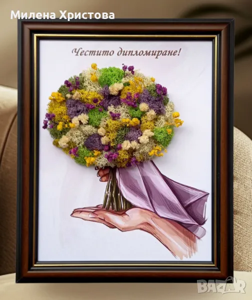 "Честито димпомиране" със сакндинавски мъх и стебилизирани цветенца. Надпис по желание. Размери 28/23 см.