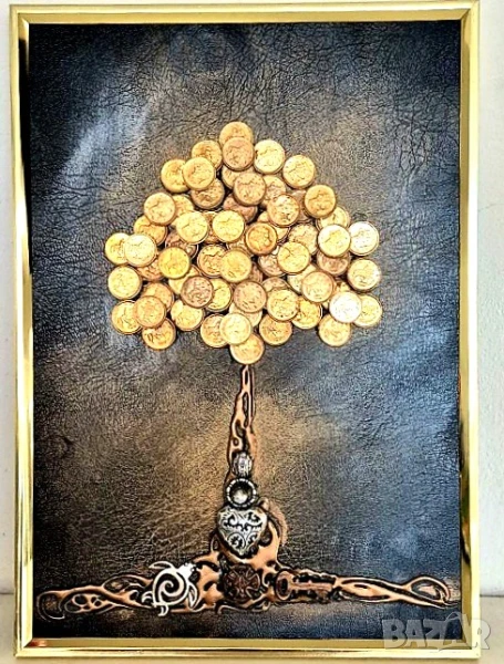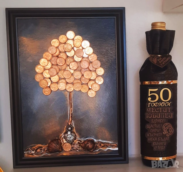 Авторска картина Дървото на живота с истински монети - комплект с юбилейна бутилка декорирана с кожа във формата на торбичка и дървена плочка със златни цифри 50 години, и пожелание "Здраве, щастие, късмет и през следващите петдесет".