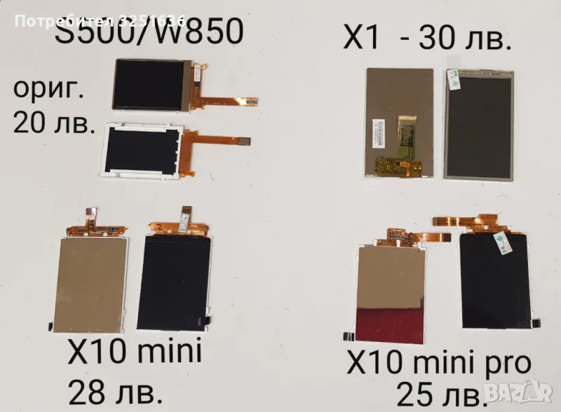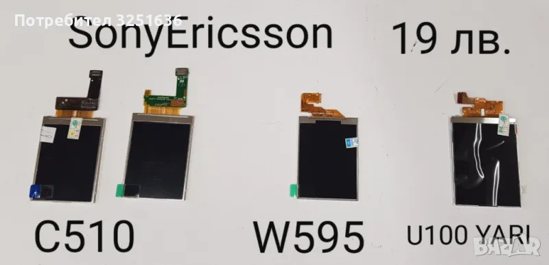 Дисплей за Sony Ericsson J10 CEDAR - 25 лв., J20 - 30 лв., J110/J120 - 15 лв., J10 ELM/K970 - 20 лв., F100 Jalou - 20 лв., S500/W850 orig. - 20 лв., X1 - 30 лв., X10 mini - 28 лв., X10 mini Pro - 25 лв., C510 - 19 лв., W595 - 19 лв., U100 YARI - 19 лв. C520/G502 - 19 лв., C905 - 19 лв., C702 - 19 лв.