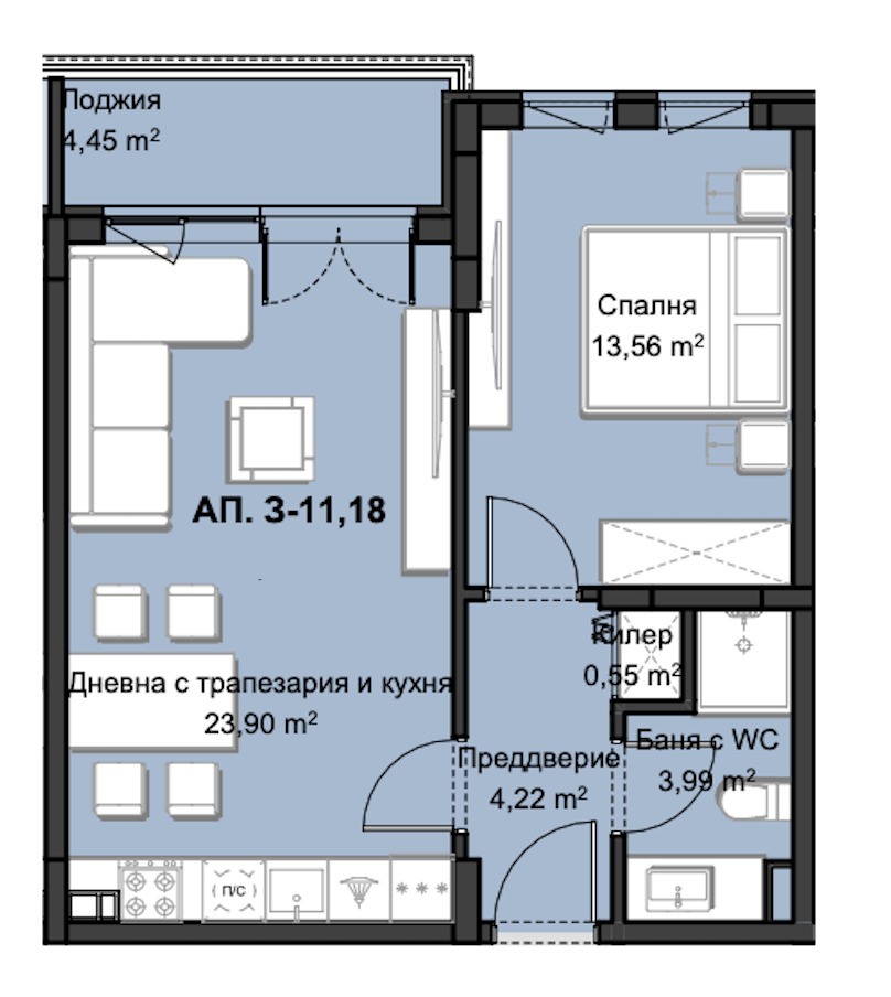 ➡ Състои се от преддверие, баня с тоалетна, килер, спалня, дневна с кухня и трапезария, тераса и е с обща площ от 74,82 кв.м.